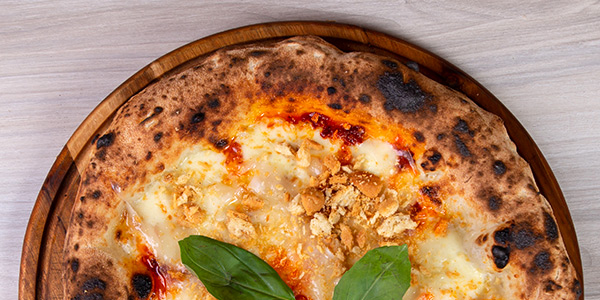 Fior di Latte misto Bufala, 'Nduja di Spilinga, Lardo di Maiale di razza casertana con Croccante di "Auciato Caranese", Olio Evo