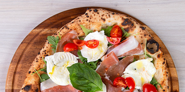 Focaccia con Prosciutto Crudo di Parma, Mozzarella di Bufala a crudo, Pomodorino Ciliegino, Rucola, Basilico, Olio Evo "Pizzolium"