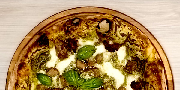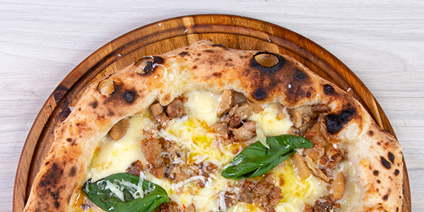 Fior di Latte misto Bufala, Salsiccia nostrana artigianale, Funghi Porcini, Scaglie di Caciocavallo del caseificio Sant'Antonio, Olio Evo