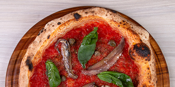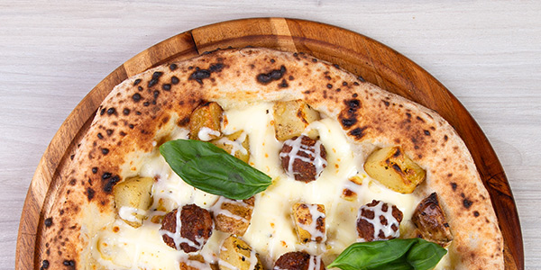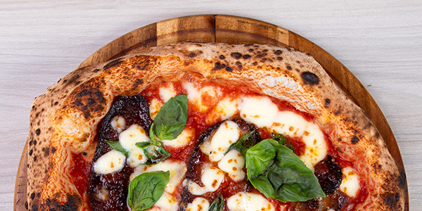 Pomodoro Pelato "Gustarosso", Fior di Latte misto Bufala, Salsiccia Piccante dei Monti Lattari, Basilico, Olio Evo