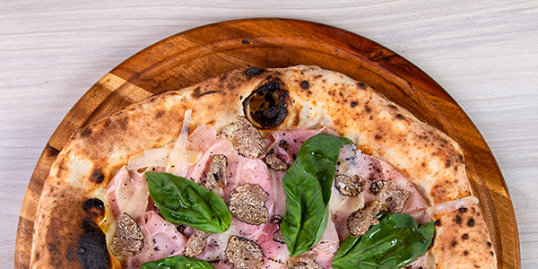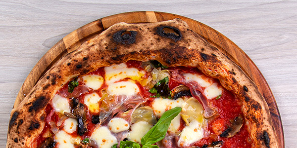 Pomodoro Pelato "Gustarosso", Fior di Latte misto Bufala, Carciofini, Prosciutto Cotto artigianale, Olive di Gaeta e Funghi, Olio Evo